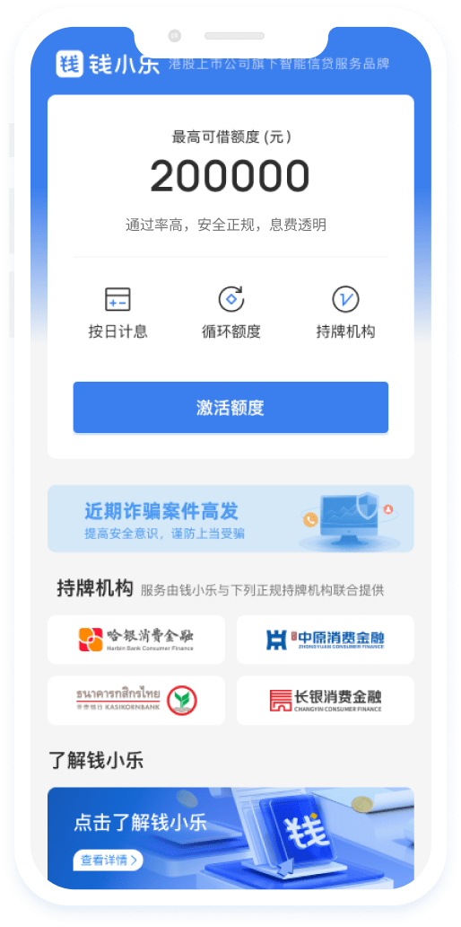 钱小乐是港股上市公司旗下智能信贷服务品牌,以“乐观向前,遇见美好生活”为服务理念,通过与持牌金融机构合作,同时广泛布局和嵌入多元生态场景,为个人用户和小微企业提供安全、智能、触手可及的信贷服务。具有申请简单、额度高、放款快、息费透明等特点。